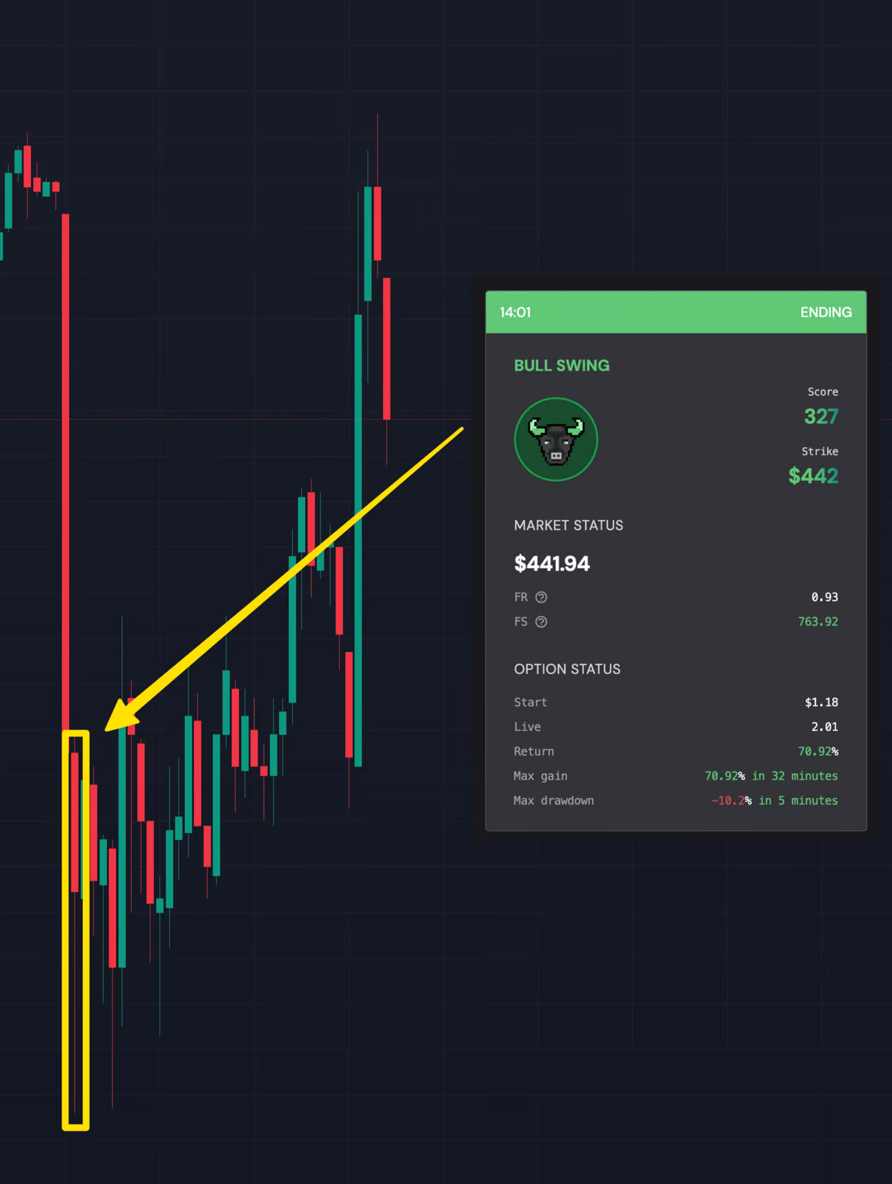 The BULL SWING is a perfect tag of the bottom candle and returns 70.92% in 32 minutes.&#x20;