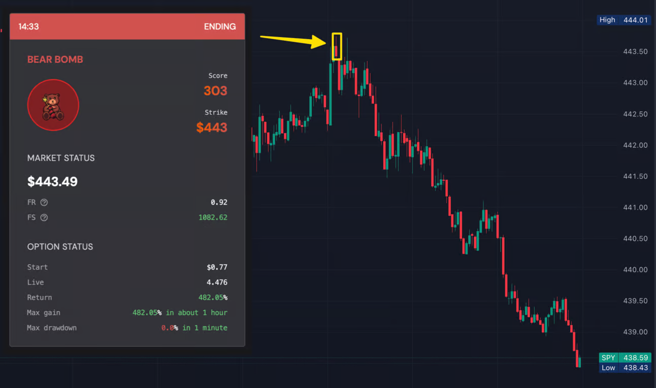 This ends up being the best trade of the day returning 482.05% with no drawdown.